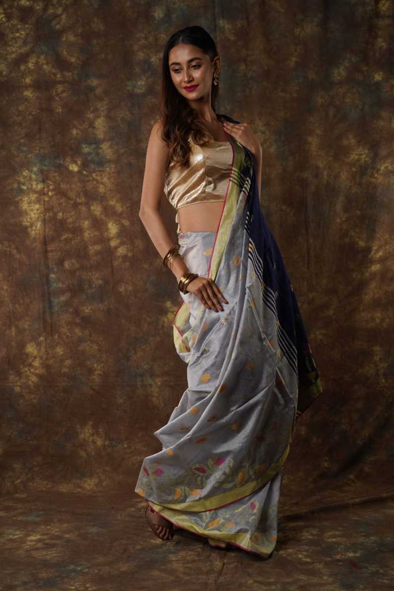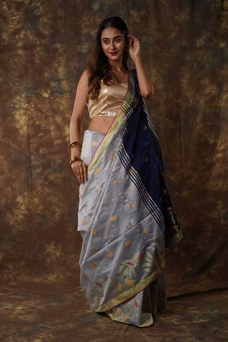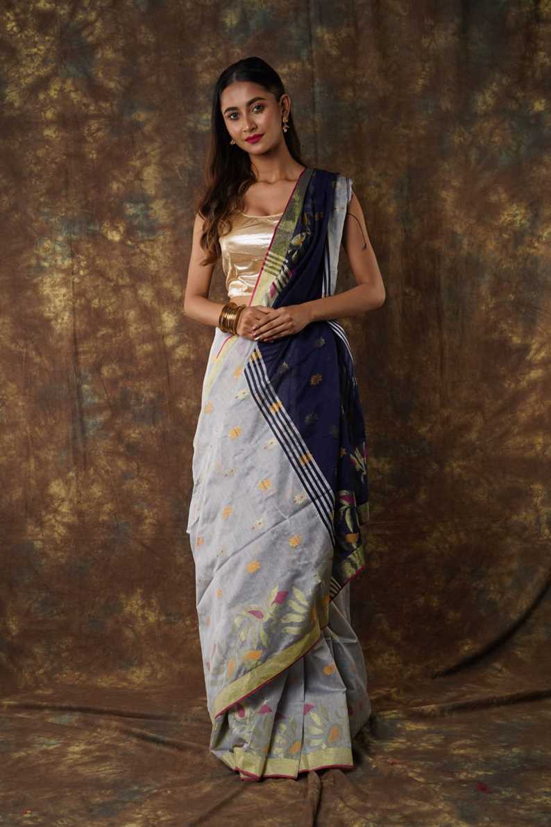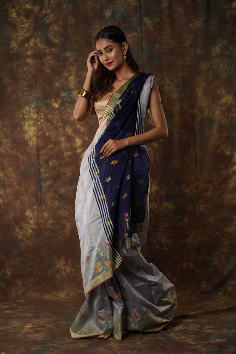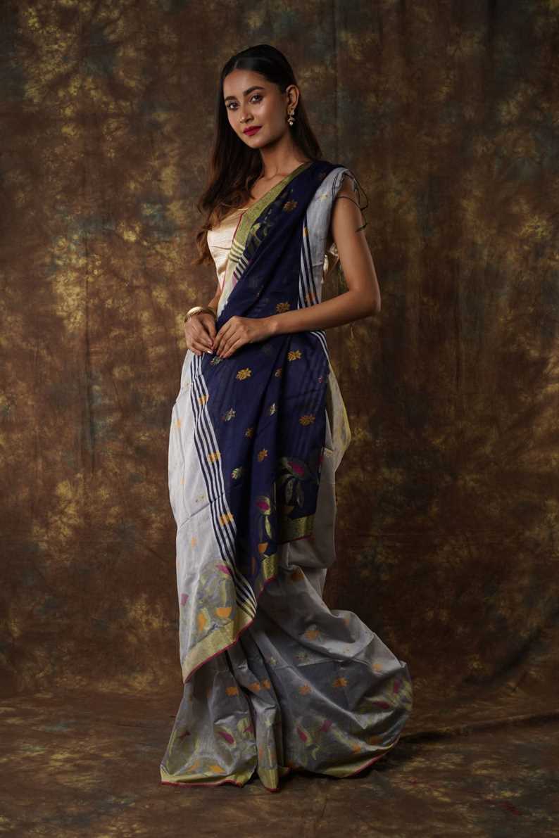 Traditional Bengal Cotton Silk Soft Jamdani Saree with navy blue colour combination ,Handwoven in the Rich Heritage of Bengal Minakari Dhakai | Item Length: 5.5 Metres Width: 1.2 Meters | Without Blouse Piece.DN NO -1008