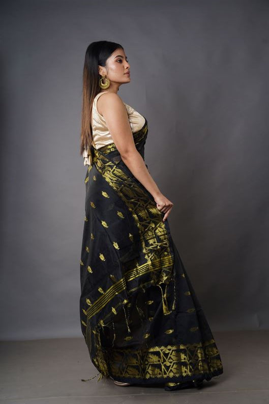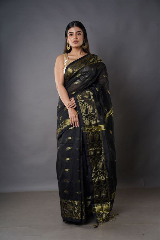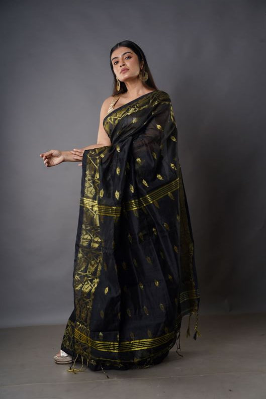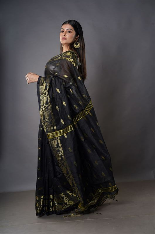 Traditional Bengal Cotton Silk Soft Jamdani Saree with Black floral combination ,Handwoven in the Rich Heritage of Bengal Minakari Dhakai | Item Length: 5.5 Metres Width: 1.2 Meters | Without Blouse Piece.DN NO-1025