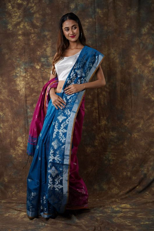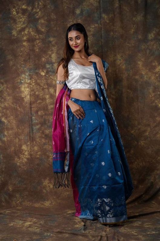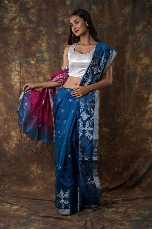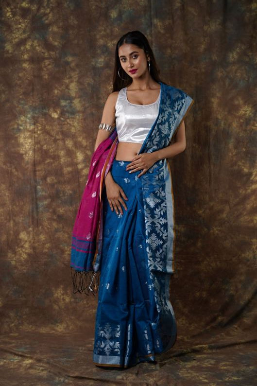 Traditional Bengal Cotton Silk Soft Jamdani Saree with navy blue colour combination ,Handwoven in the Rich Heritage of Bengal Minakari Dhakai | Item Length: 5.5 Metres Width: 1.2 Meters | Without Blouse Piece.DN NO -1008