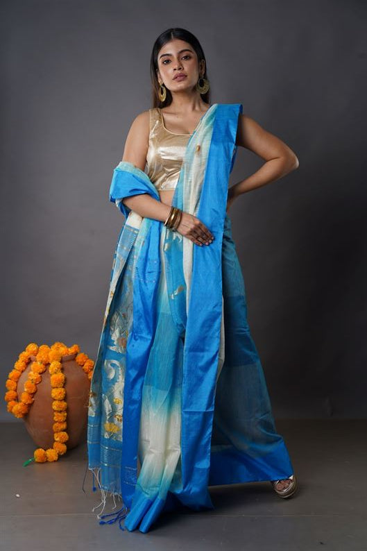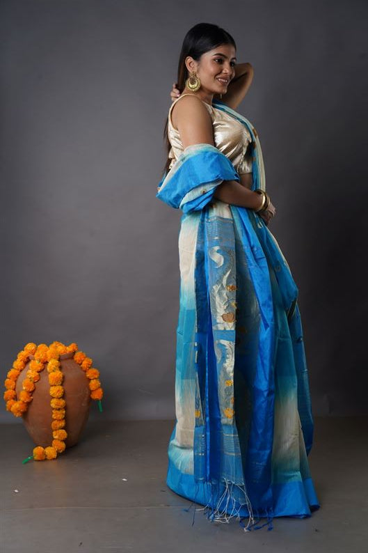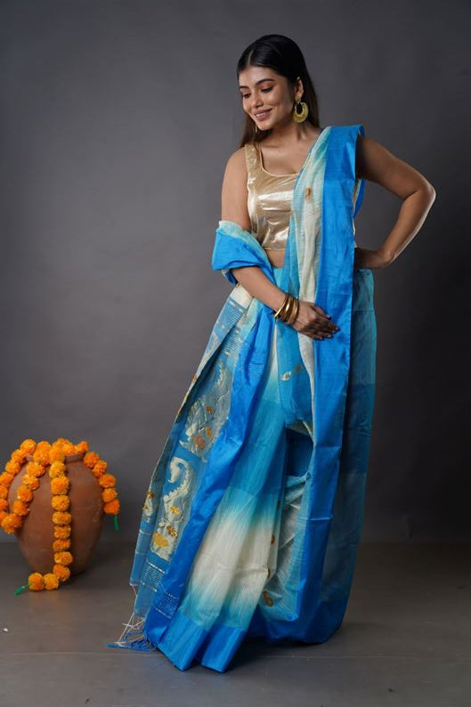 Traditional Bengal Cotton Silk Soft Jamdani Saree with lite sky floral combination ,Handwoven in the Rich Heritage of Bengal Minakari Dhakai | Item Length: 5.5 Metres Width: 1.2 Meters | Without Blouse Piece.DN NO-1032