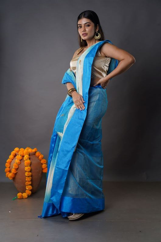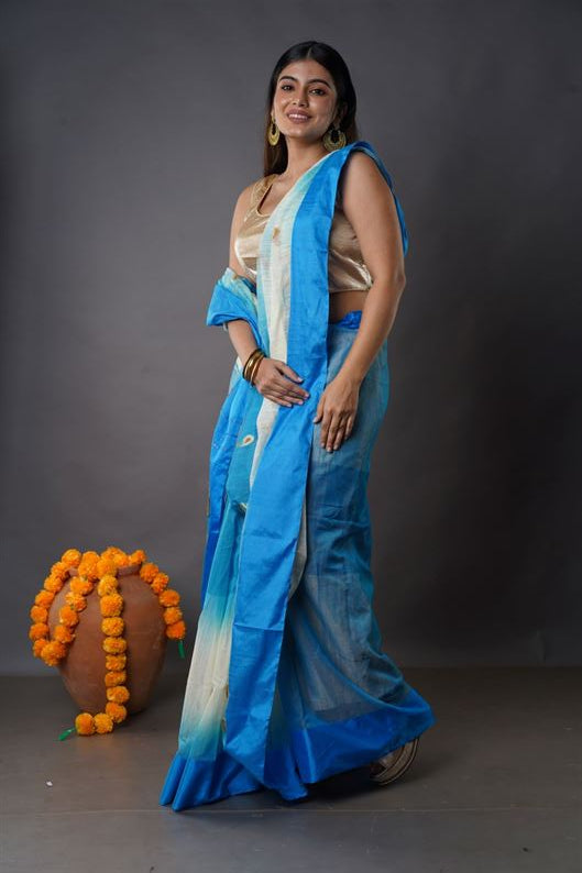 Traditional Soft Mulmul sky & white colour Bengal Handloom Pure Cotton Saree Without Blouse Piece.DN NO-1055