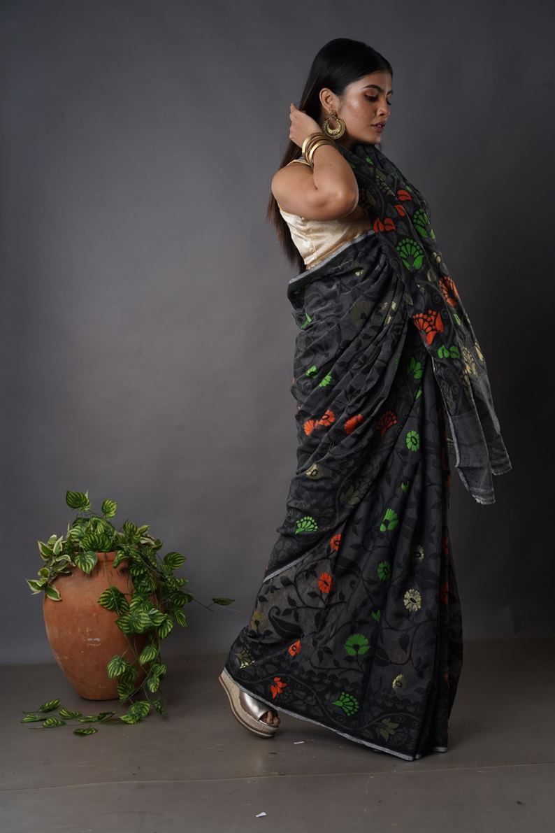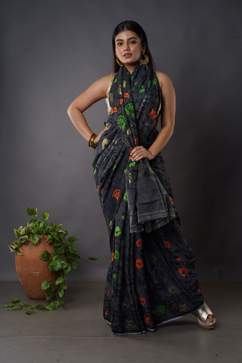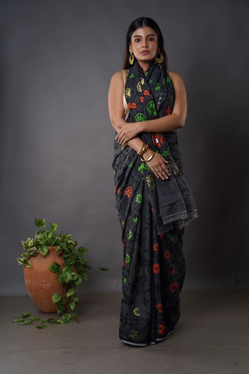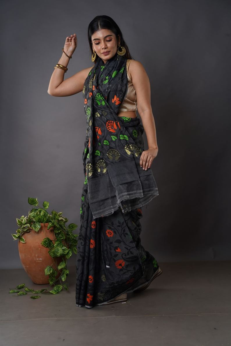Traditional Bengal Cotton Silk Soft Jamdani Saree with Black floral combination ,Handwoven in the Rich Heritage of Bengal Minakari Dhakai | Item Length: 5.5 Metres Width: 1.2 Meters | Without Blouse Piece.DN NO-1025