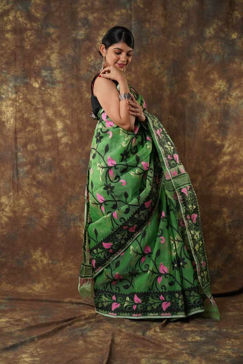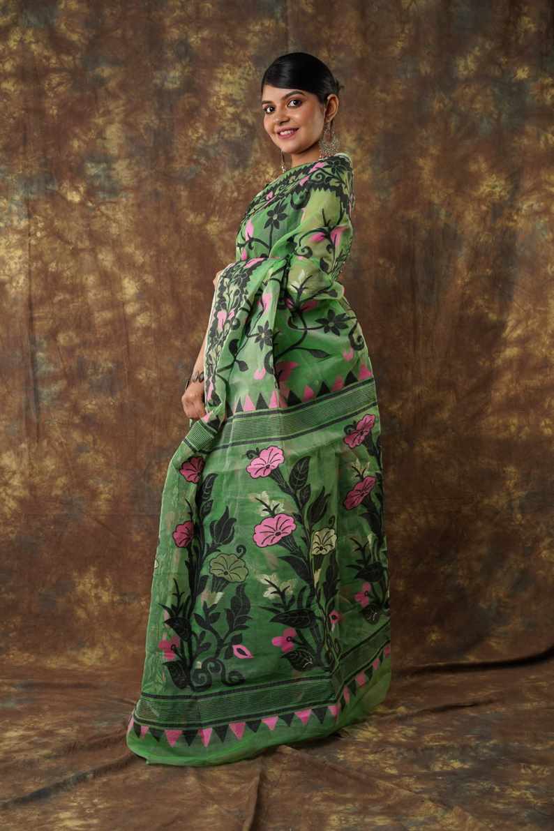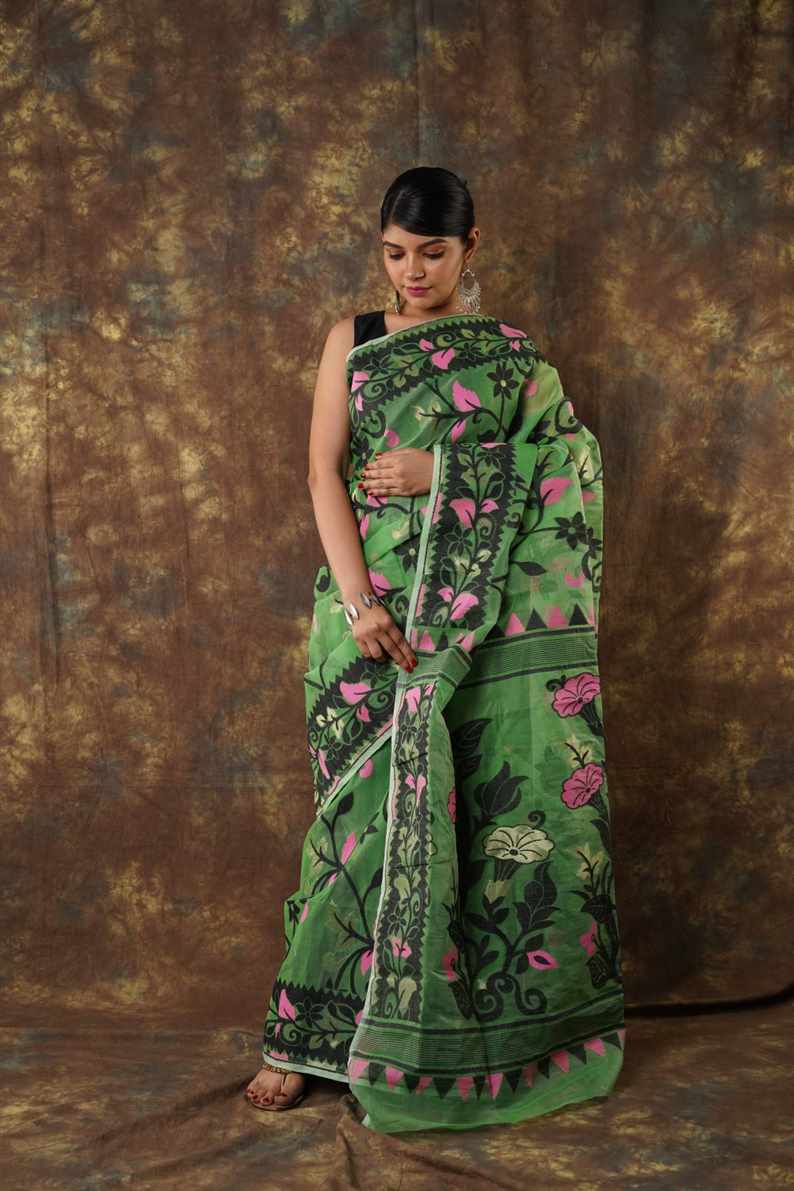 Traditional Bengal Cotton Silk Soft Jamdani Saree with green colour floral combination ,Handwoven in the Rich Heritage of Bengal Minakari Dhakai | Item Length: 5.5 Metres Width: 1.2 Meters | Without Blouse Piece.DN NO-1030