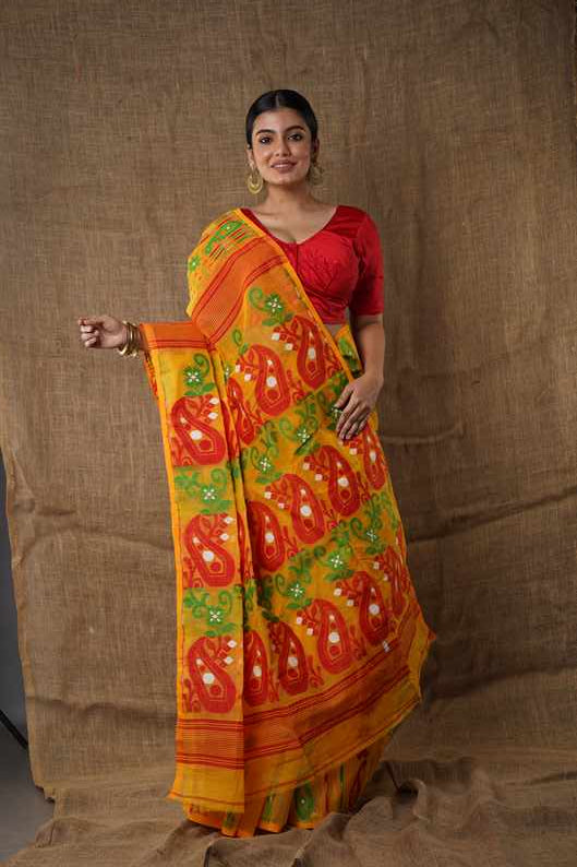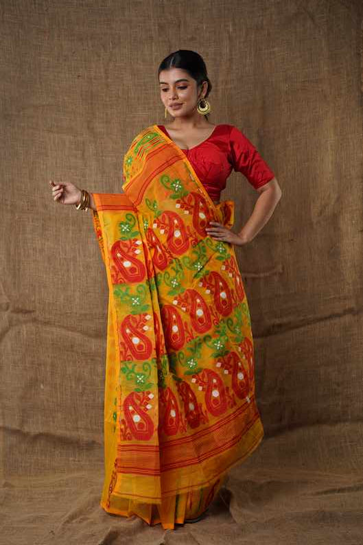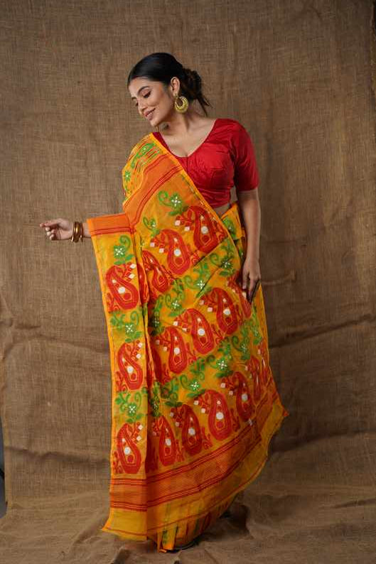 Traditional Bengal Cotton Silk Soft Jamdani Saree with the yellow colour combination, Handwoven in the Rich Heritage of Bengal Minakari Dhakai | Item Length: 5.5 Metres Width: 1.2 Meters | Without Blouse Piece.DN NO-1029