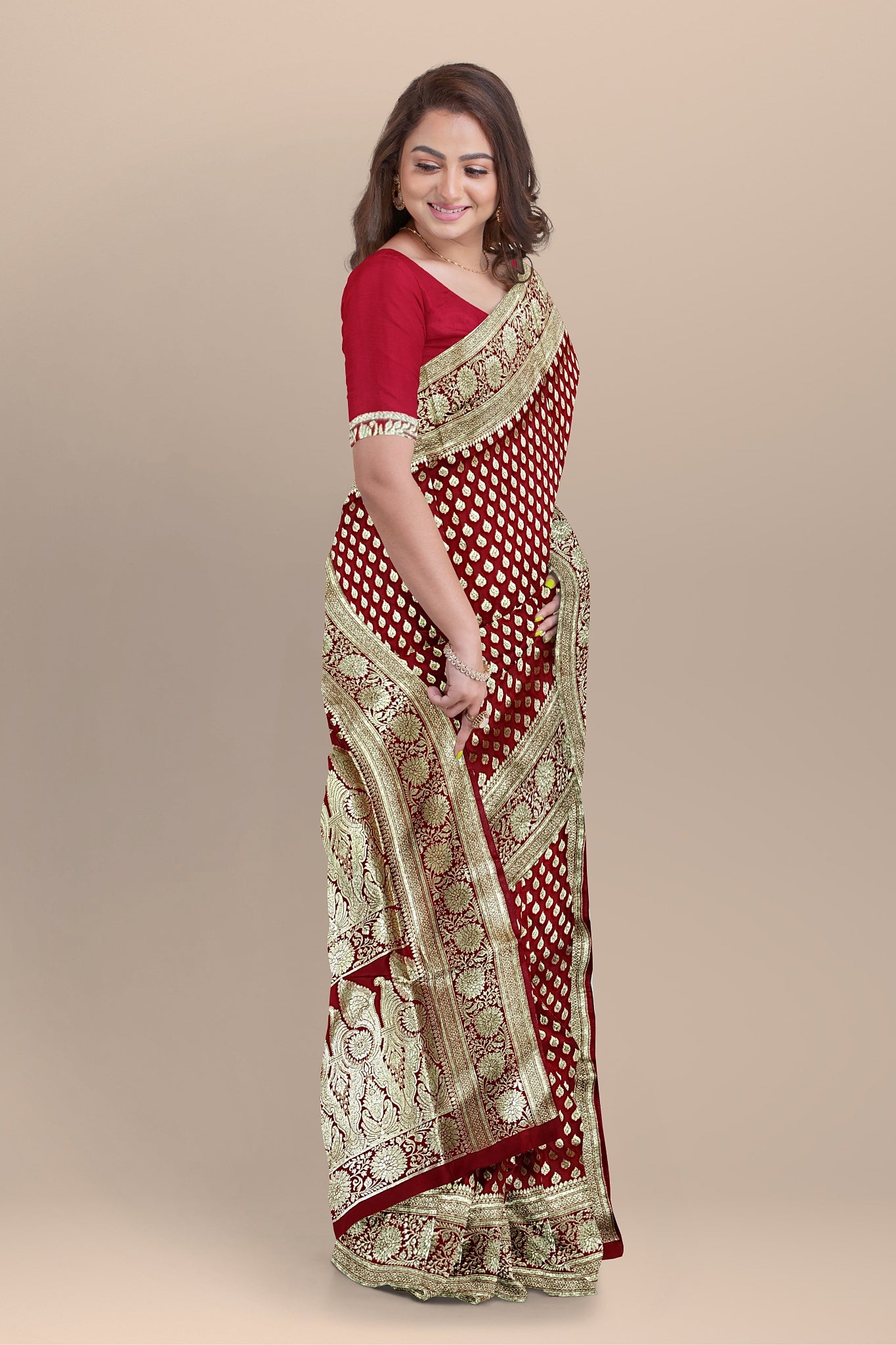 · Blouse Piece: Matching red color plain blouse piece featuring a rich golden border, 1.5 meters in length