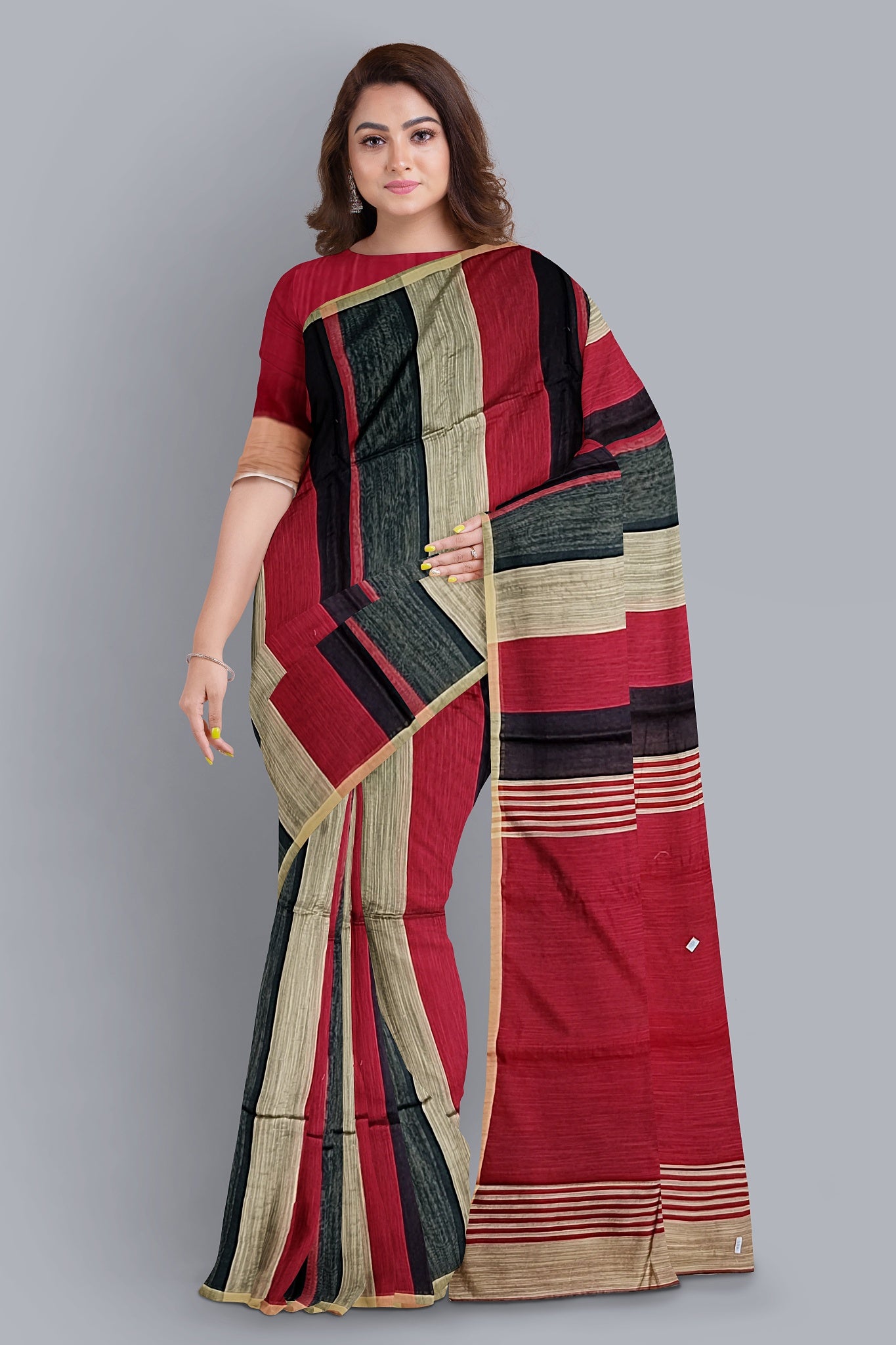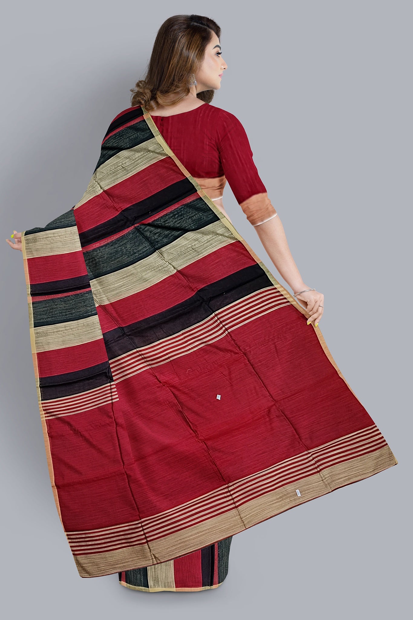 The saree's body showcases a mesmerizing stripe pattern, blending shades of red, black, and biscuit to create a harmonious and visually appealing design. The understated elegance of the plain Par complements the striking striped body, adding a touch of simplicity to the overall look.