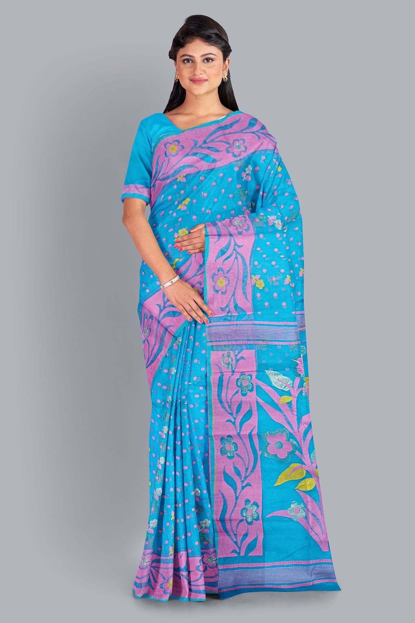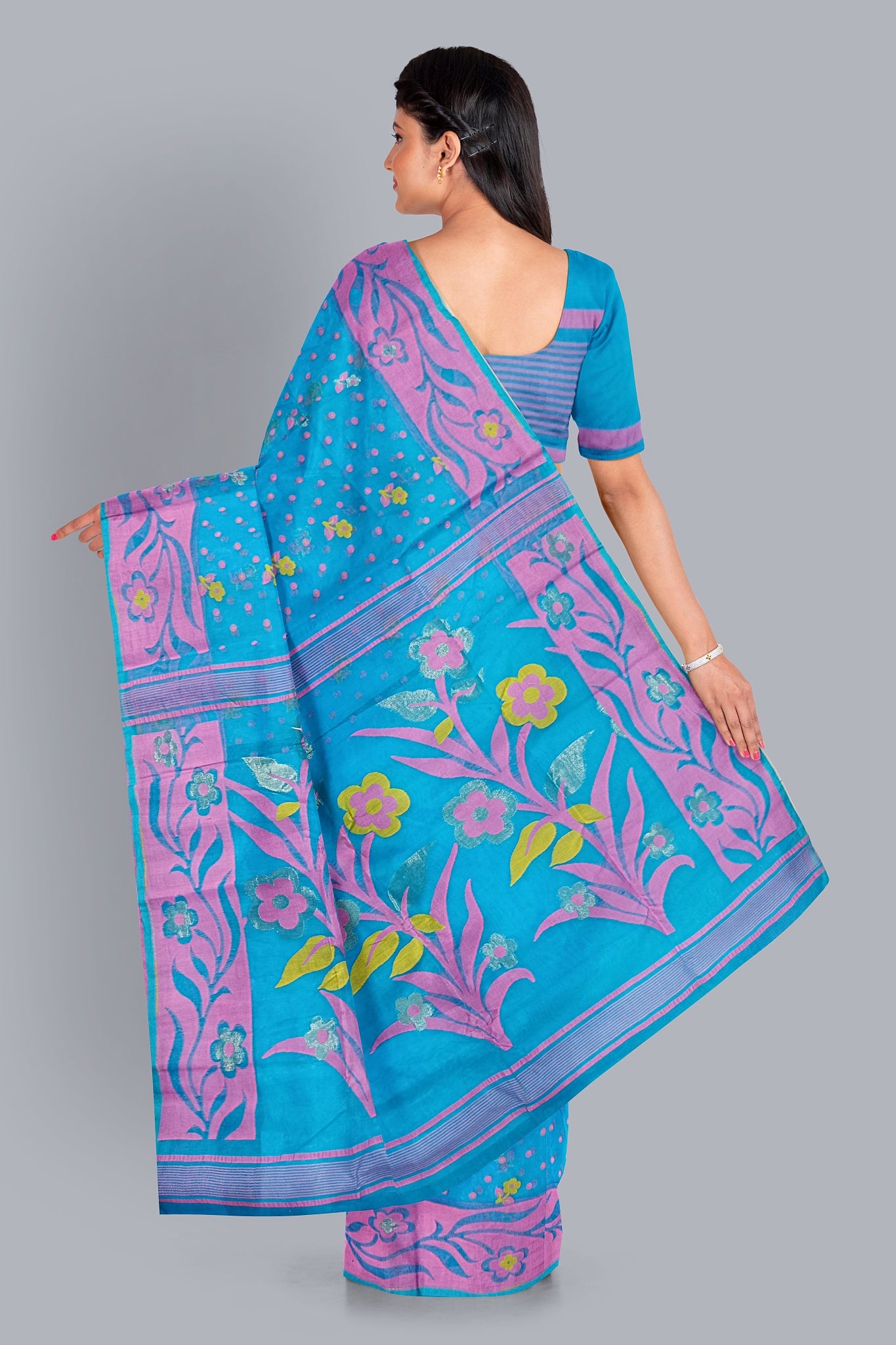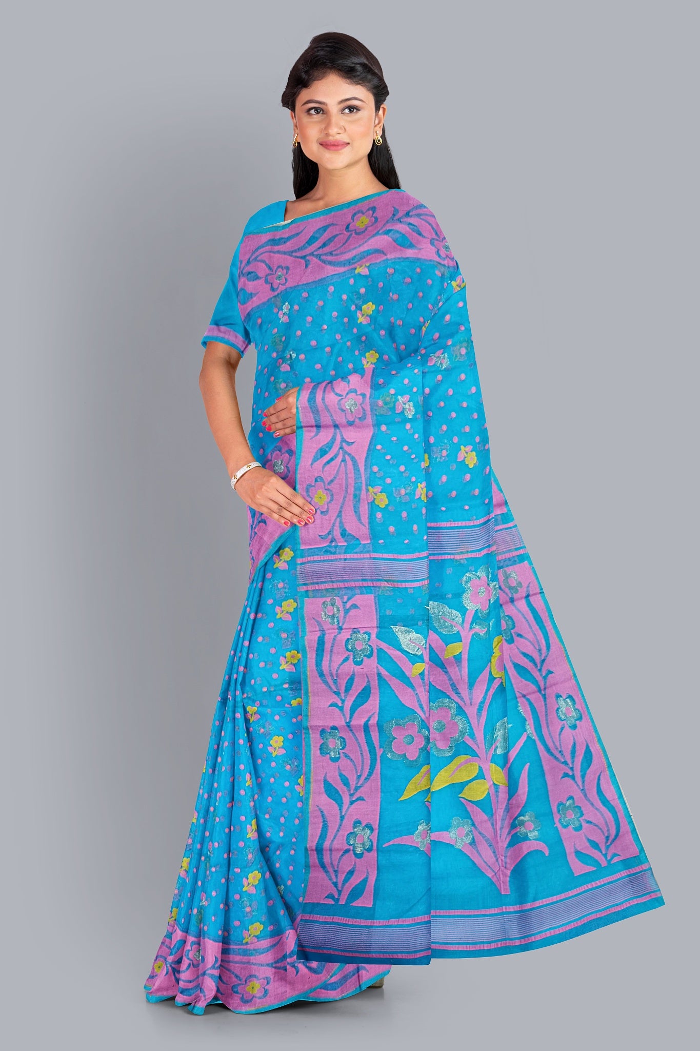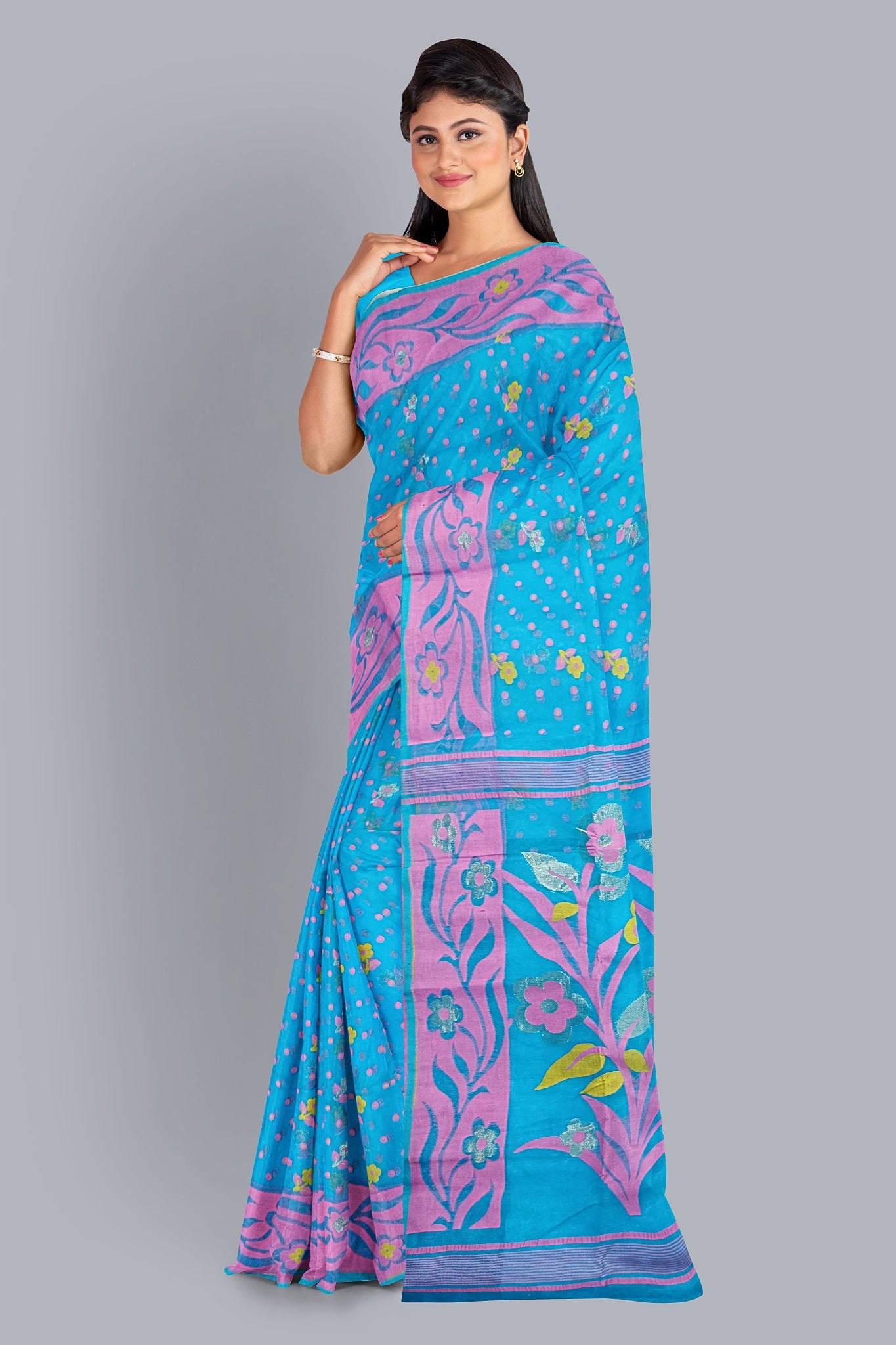 Traditional Bengal Cotton Silk Soft Jamdani Saree with lite sky floral combination ,Handwoven in the Rich Heritage of Bengal Minakari Dhakai | Item Length: 5.5 Metres Width: 1.2 Meters | Without Blouse Piece.DN NO-1032