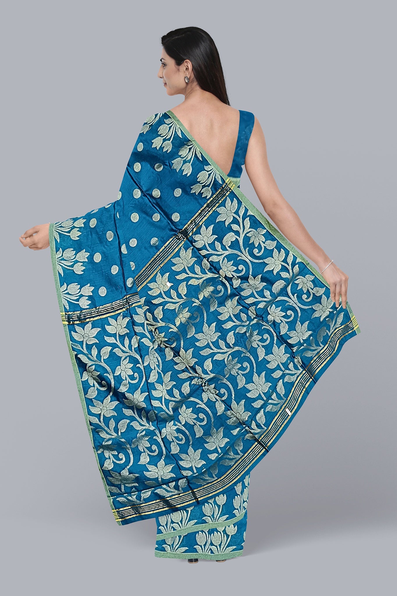 Traditional Bengal Cotton Silk Soft Jamdani Saree with navy blue colour combination ,Handwoven in the Rich Heritage of Bengal Minakari Dhakai | Item Length: 5.5 Metres Width: 1.2 Meters | Without Blouse Piece.DN NO -1008