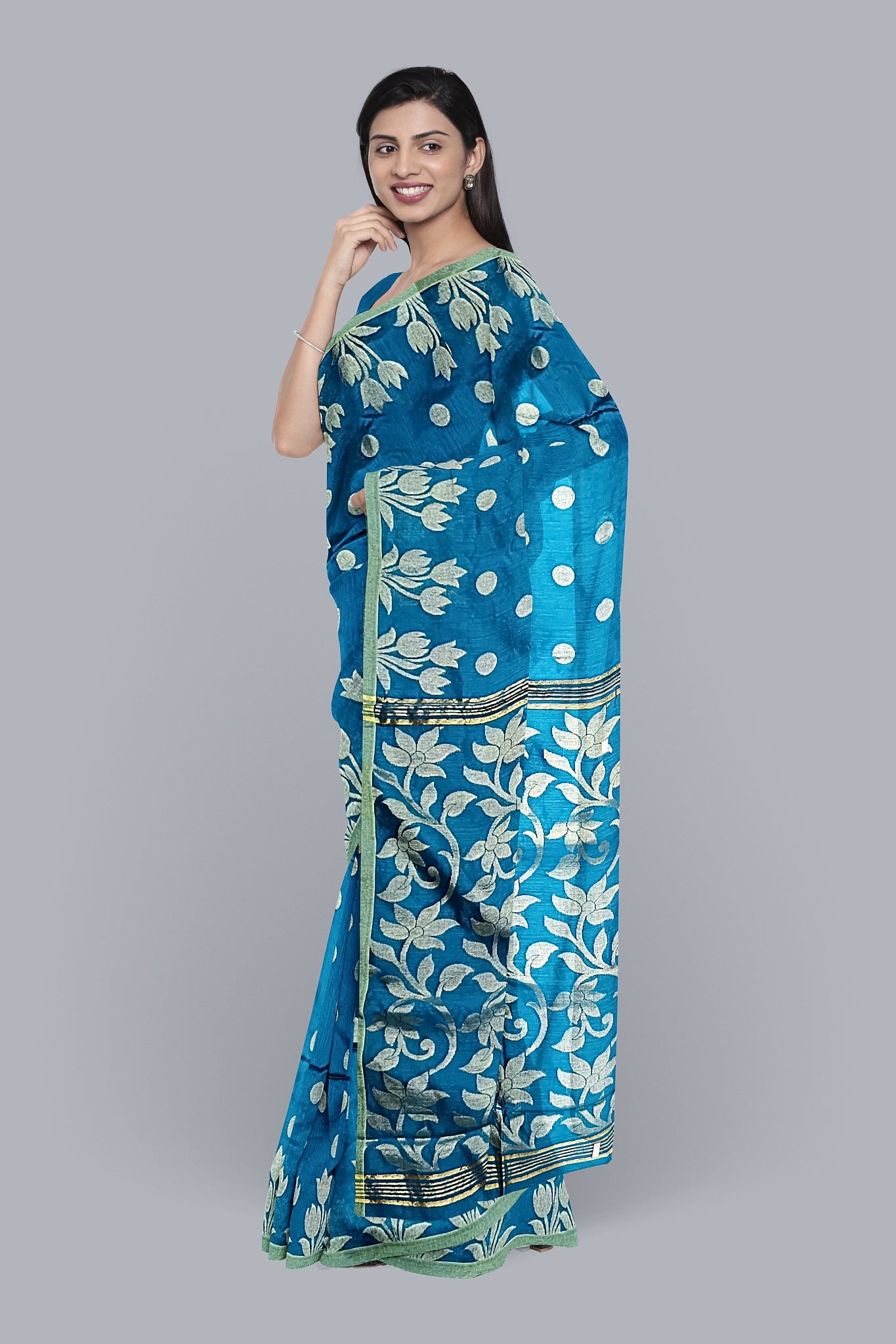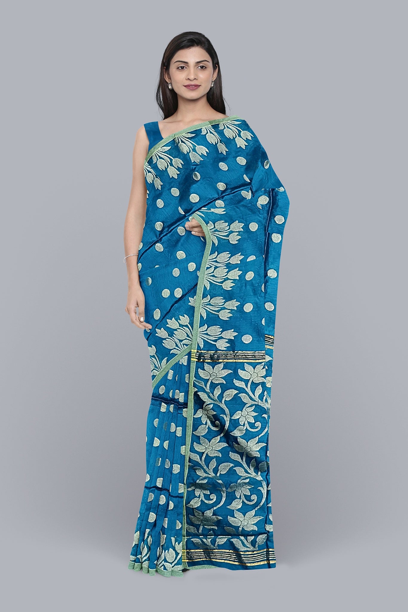Traditional Bengal Cotton Silk Soft Jamdani Saree with lite sky floral combination ,Handwoven in the Rich Heritage of Bengal Minakari Dhakai | Item Length: 5.5 Metres Width: 1.2 Meters | Without Blouse Piece.DN NO-1032