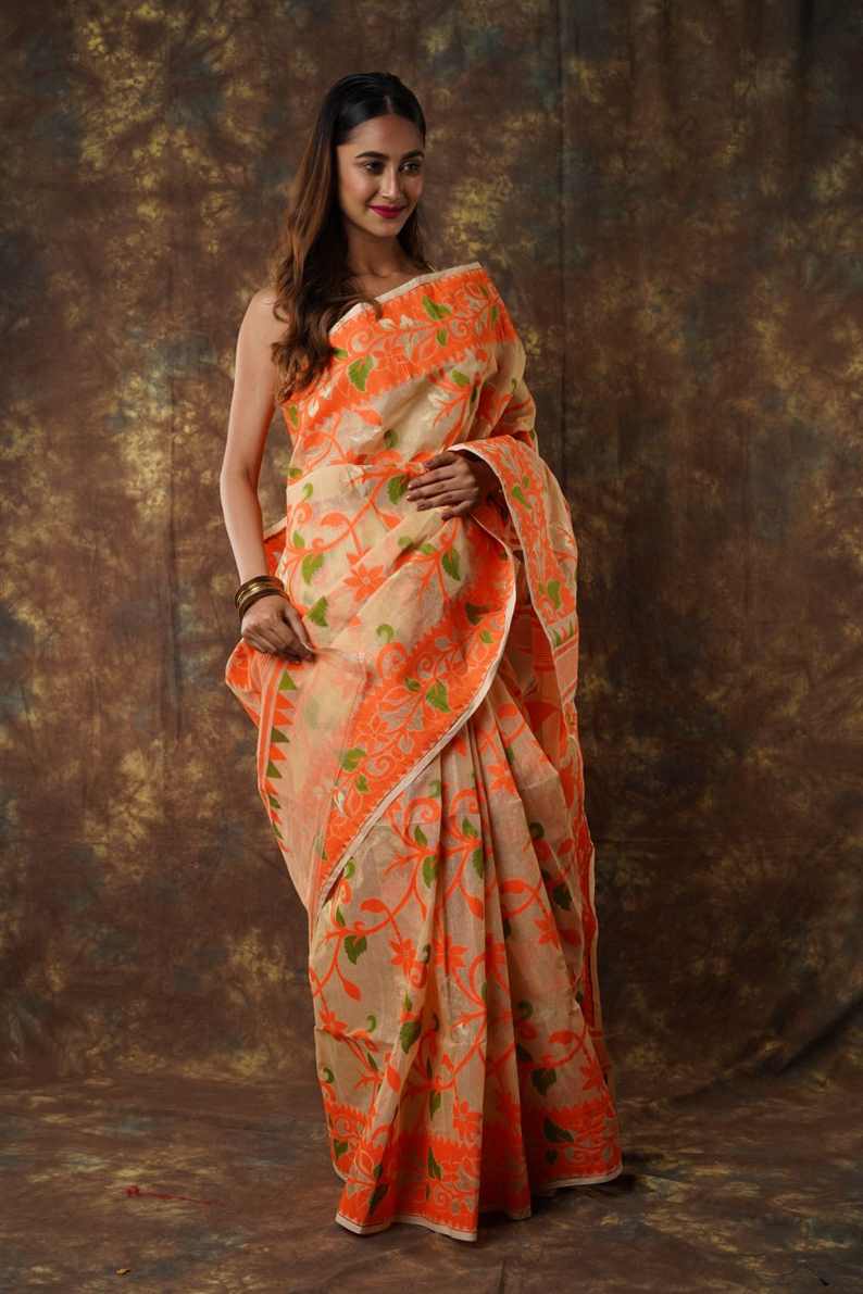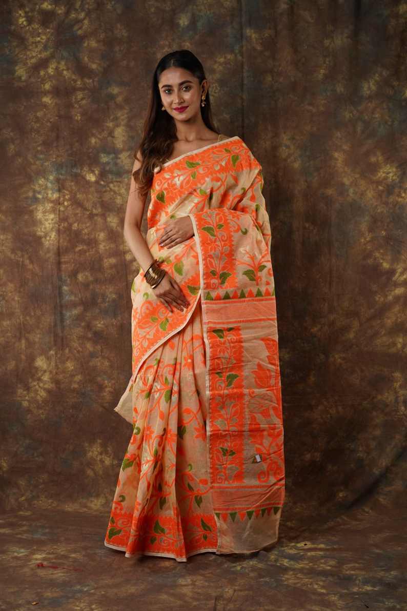 Traditional Bengal Cotton Silk Soft Jamdani Saree with orang colour floral combination ,Handwoven in the Rich Heritage of Bengal Minakari Dhakai | Item Length: 5.5 Metres Width: 1.2 Meters | Without Blouse Piece.DN NO-1031