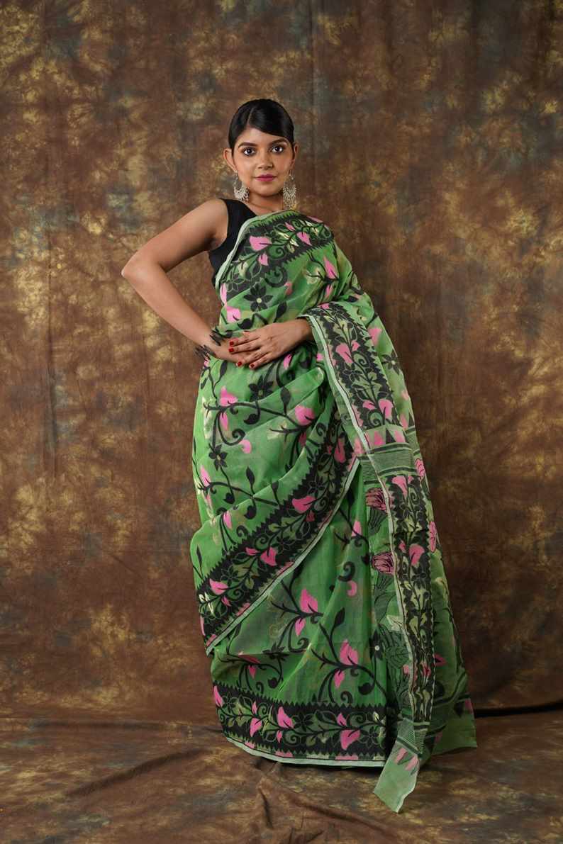 Traditional Bengal Cotton Silk Soft Jamdani Saree with green colour floral combination ,Handwoven in the Rich Heritage of Bengal Minakari Dhakai | Item Length: 5.5 Metres Width: 1.2 Meters | Without Blouse Piece.