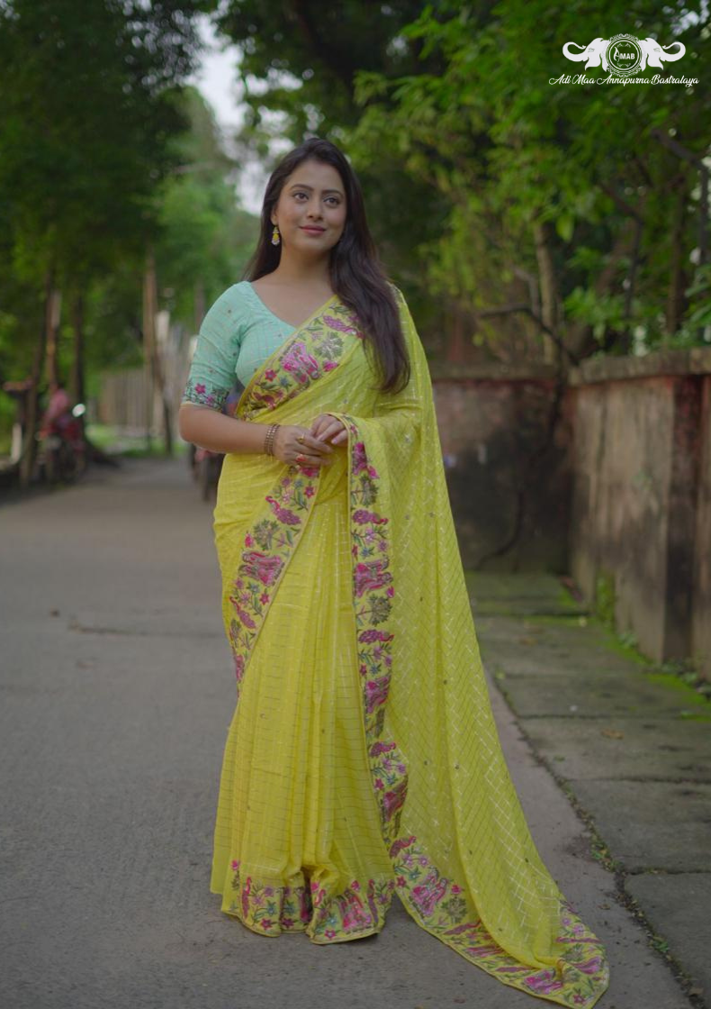 Exquisite Firoza Soft Jamdani Saree with Yellow and White Accents,DN NO-1071