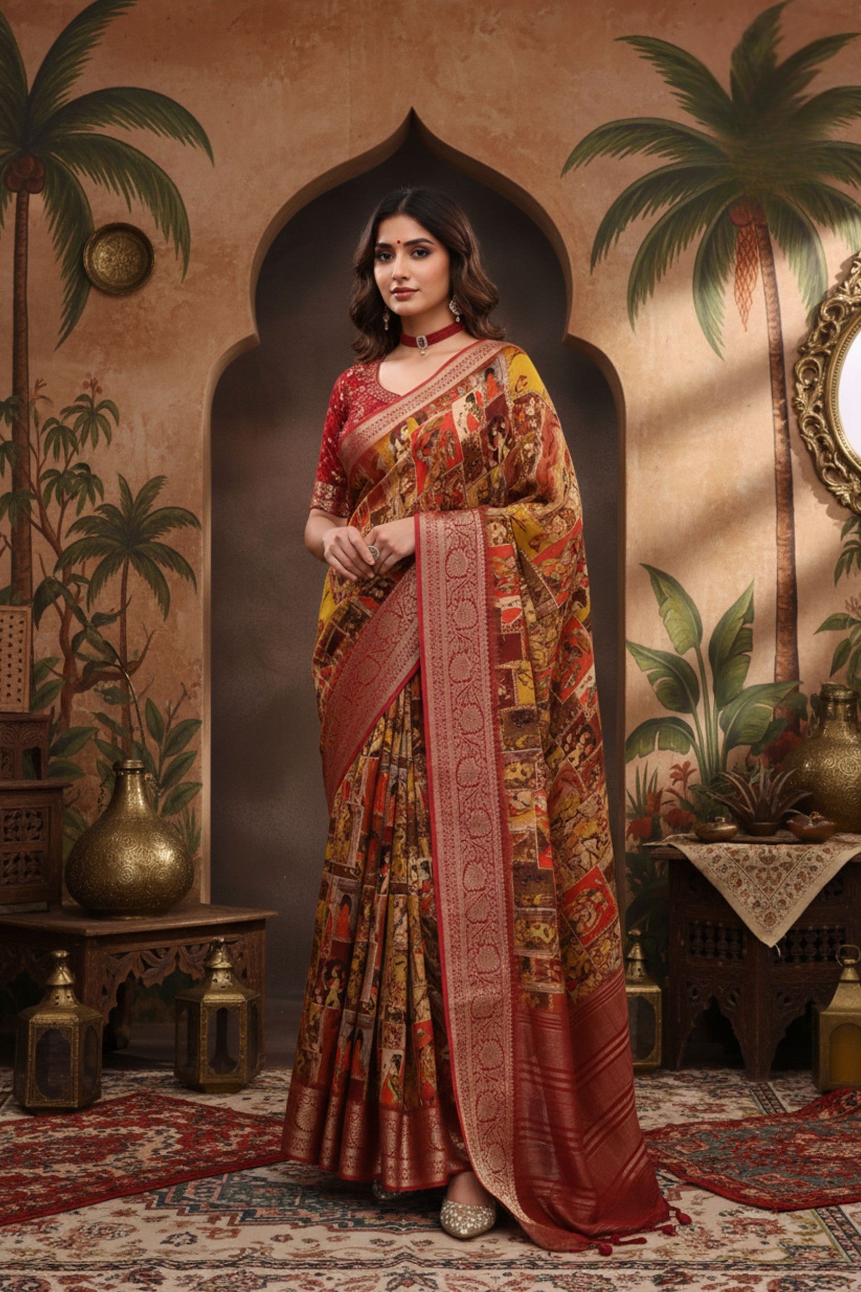 Elevate your ethnic wardrobe with this elegant Madhubani art silk saree. Adorned with intricate traditional motifs and a rich zari border, it blends timeless charm with modern sophistication, ideal for festive occasions and celebrations.