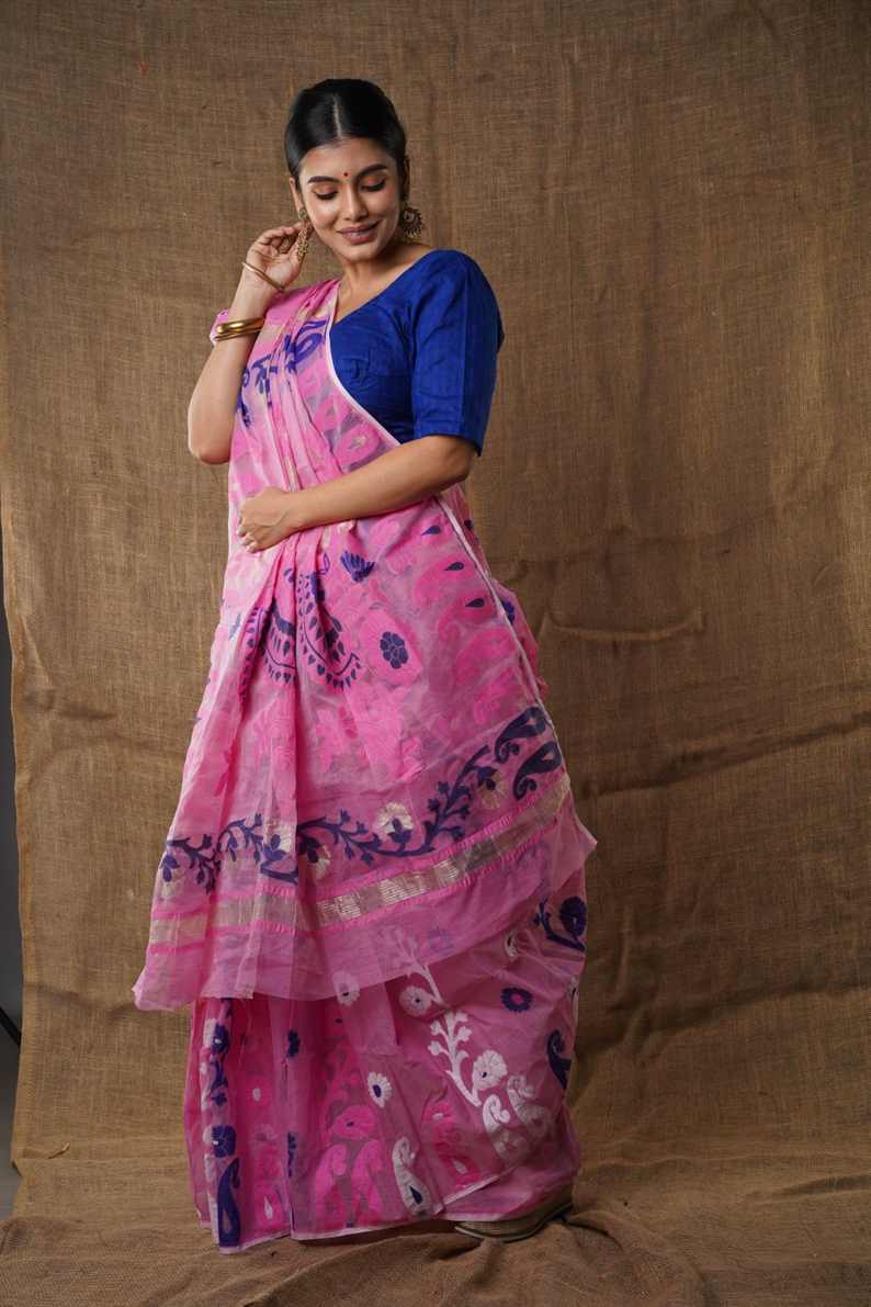 Traditional Bengal Cotton Silk Soft Jamdani Saree with pink colour floral combination ,Handwoven in the Rich Heritage of Bengal Minakari Dhakai | Item Length: 5.5 Metres Width: 1.2 Meters | Without Blouse Piece.DN NO-1010