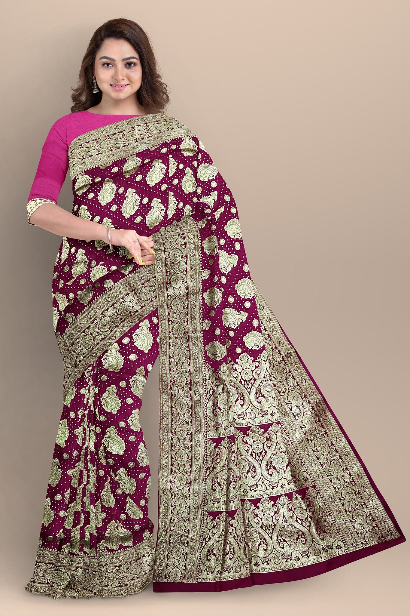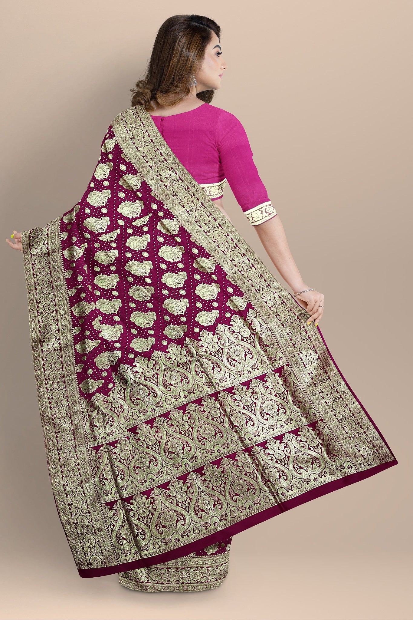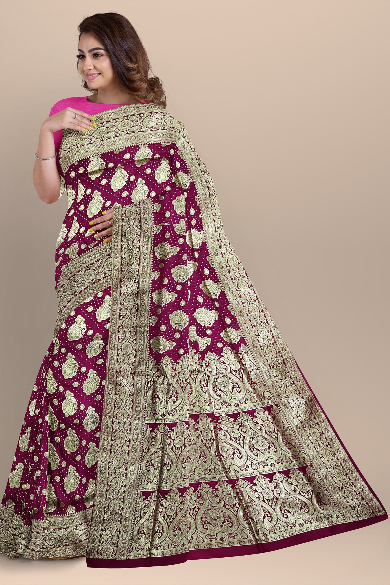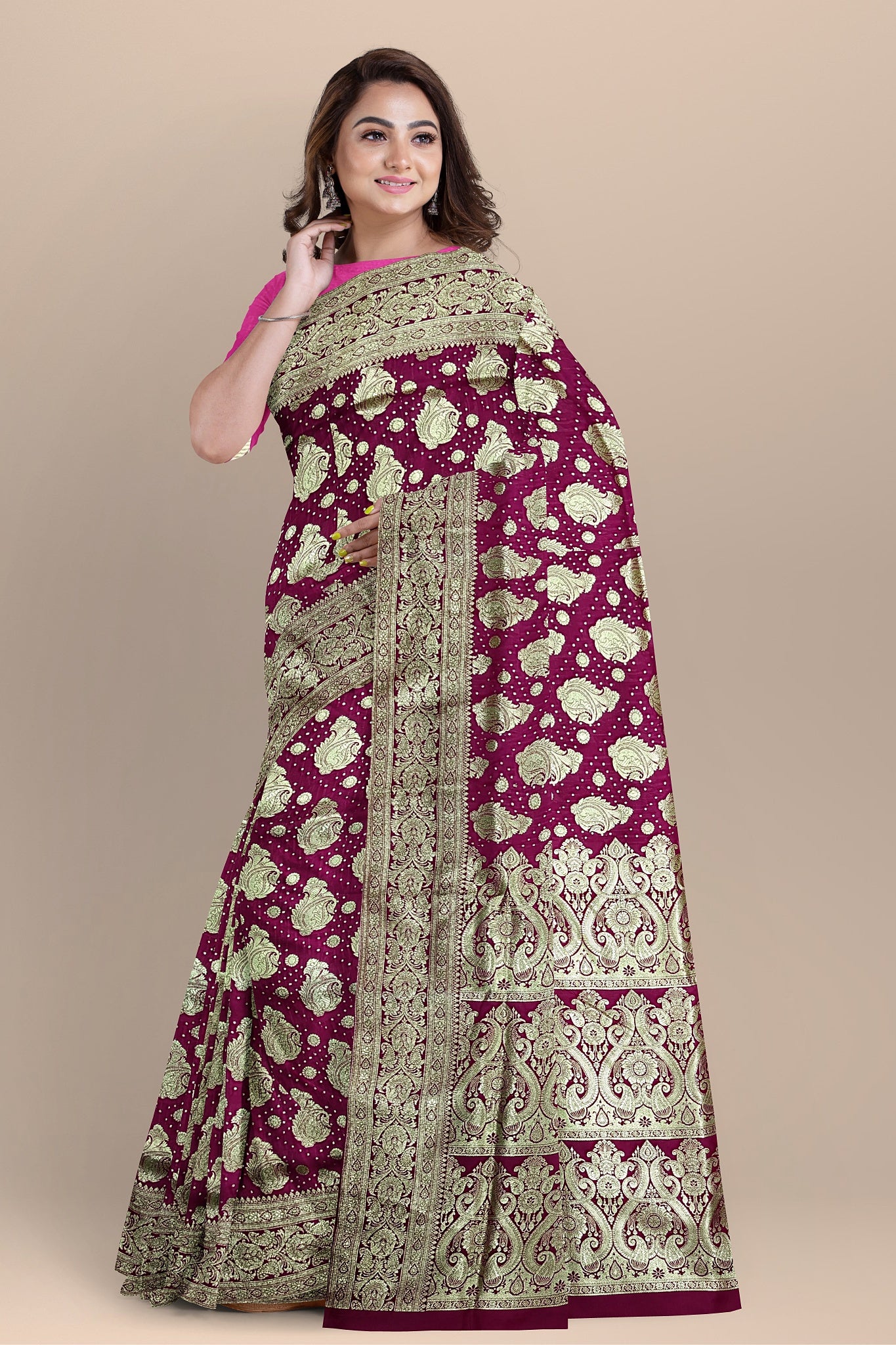 Charming Deep Pink Benarasi Saree with Golden Buta, Rani Pallu, and Blouse