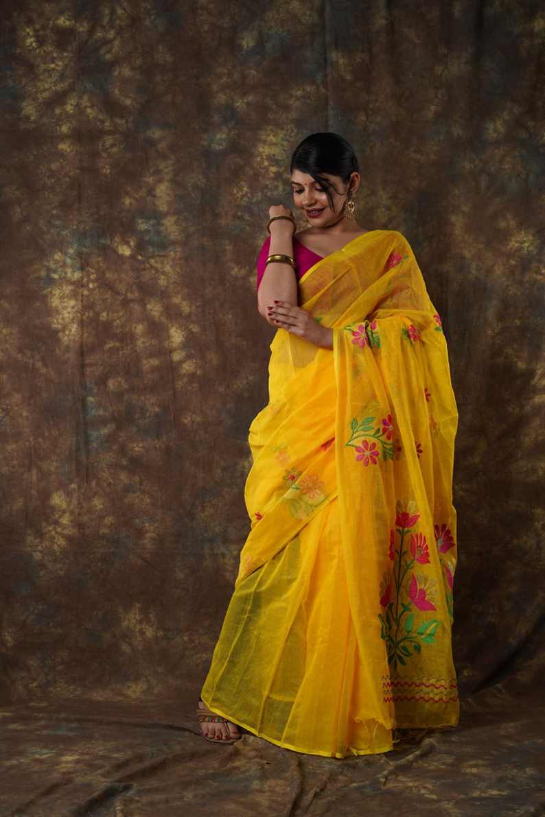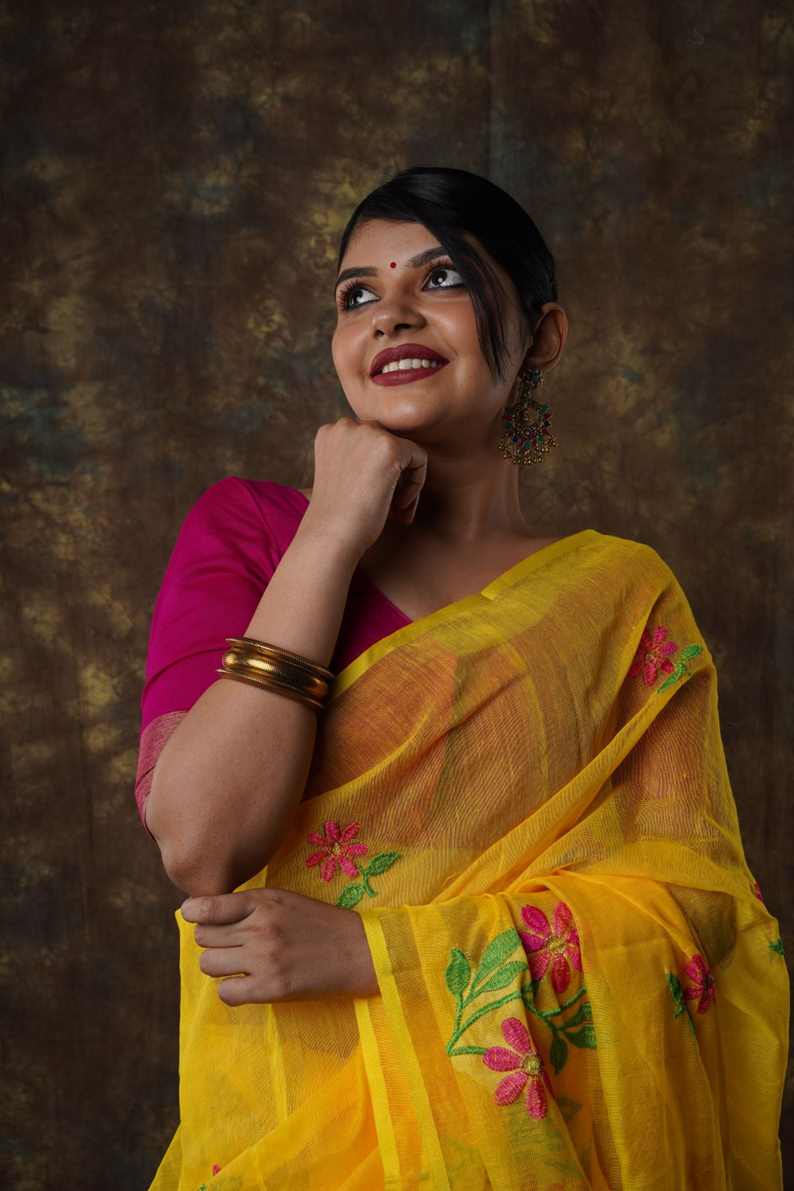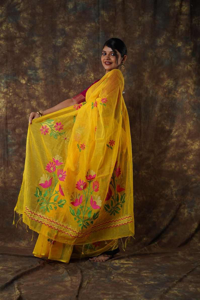 Traditional Soft Mulmul yellow colour Bengal Handloom Pure Cotton Saree Without Blouse Piece.DN NO-1066